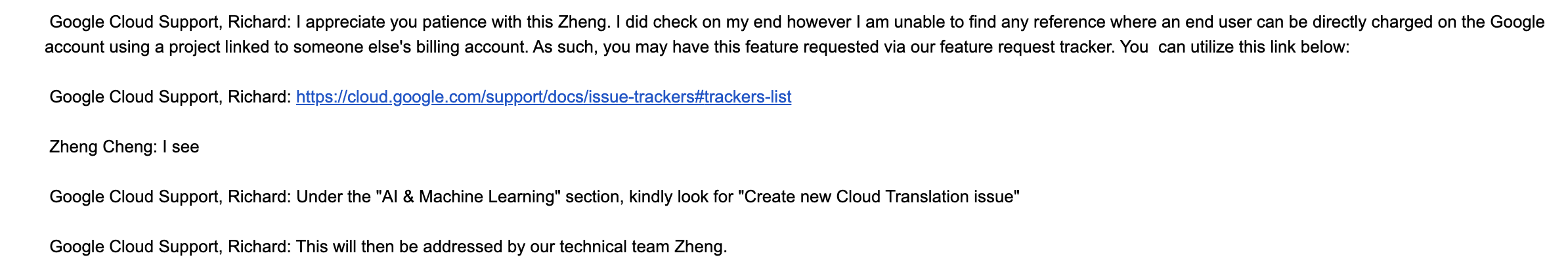 Google Cloud Support, Richard: This will then be addressed by our technical team Zheng.