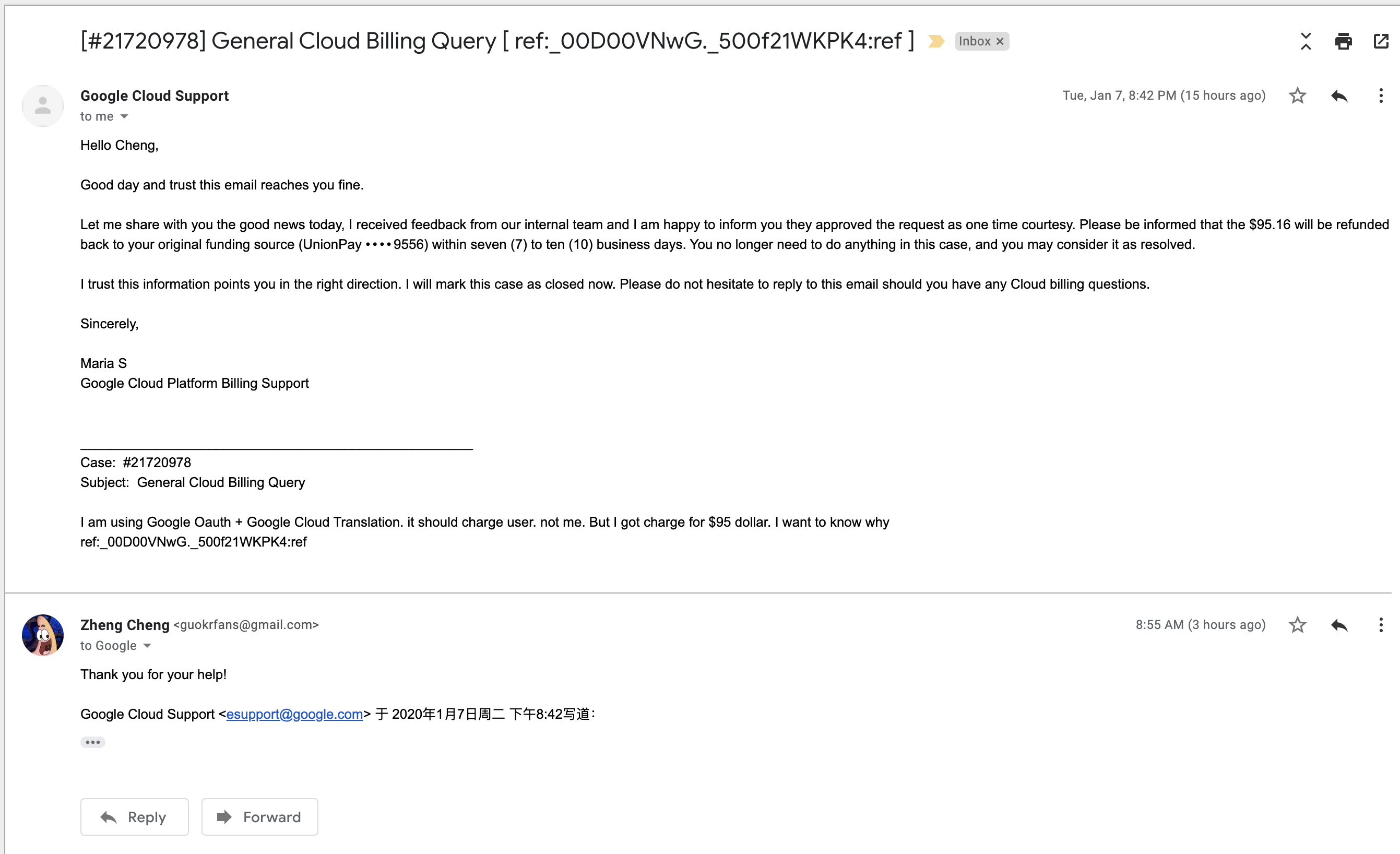 还好最后谷歌给我退了这 $95 美金