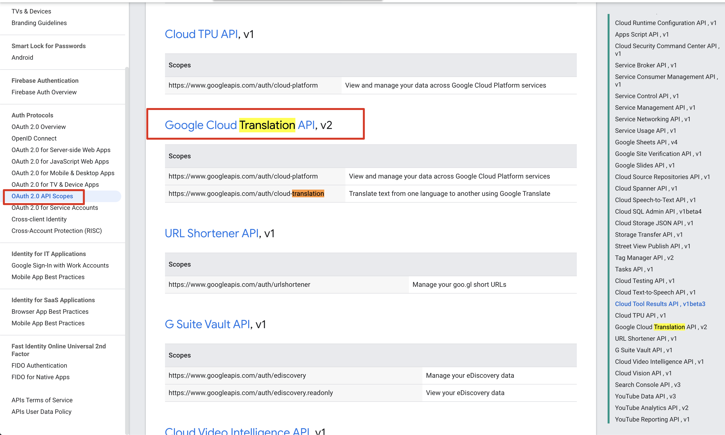 Google Cloud Support, Richard: Happy new year Zheng. :) I did look up to this and it seems that I cannot find any specific resource on my end to address your inquiry as why Translate API was included on OAuth scope. You may also include this inquiry once you file a ticket on our issue tracker (the link I provided earlier).