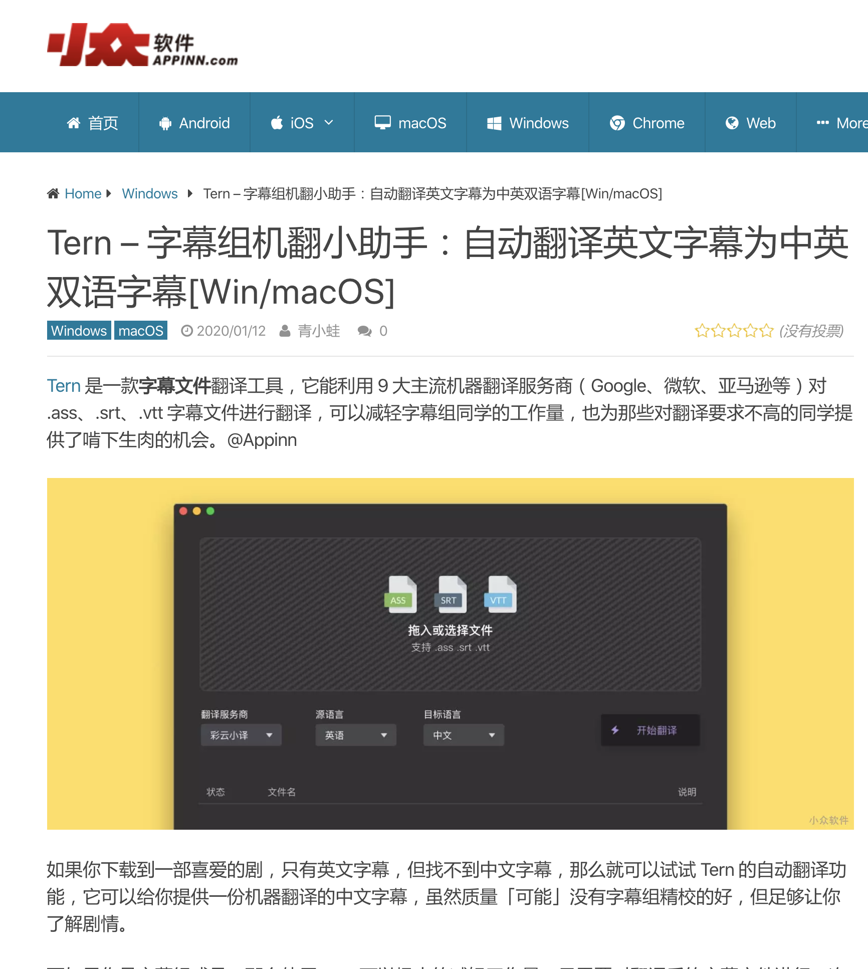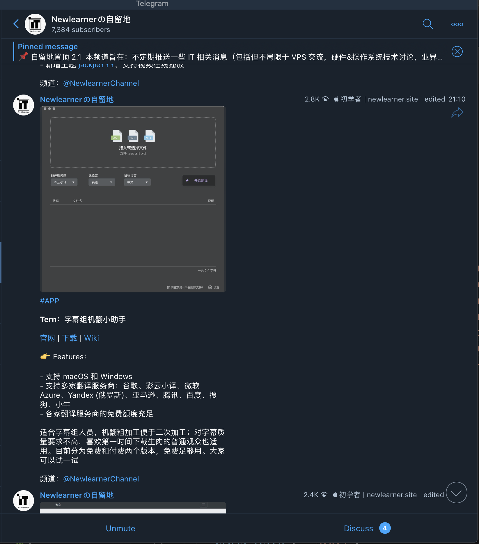 我做的"字幕组机翻小助手"被推荐拉~ 1. 被"小众软件"推荐了 https://www.appinn.com/tern-subtitle-file-translator/2. 被"Newlearner的自留地"推荐了 https://t.me/NewlearnerChannel/3551