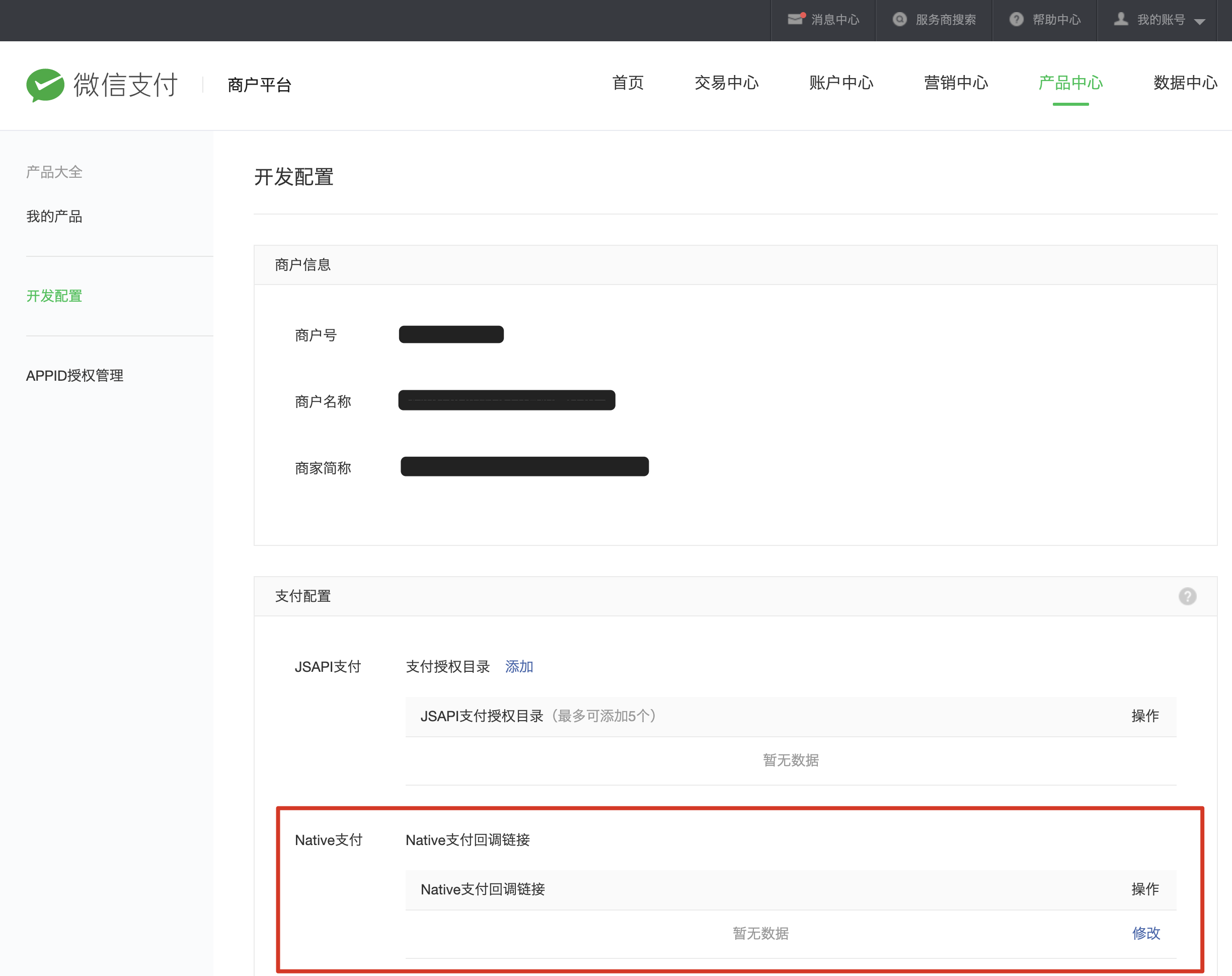 商户平台 -> 产品中心 -> 开发配置