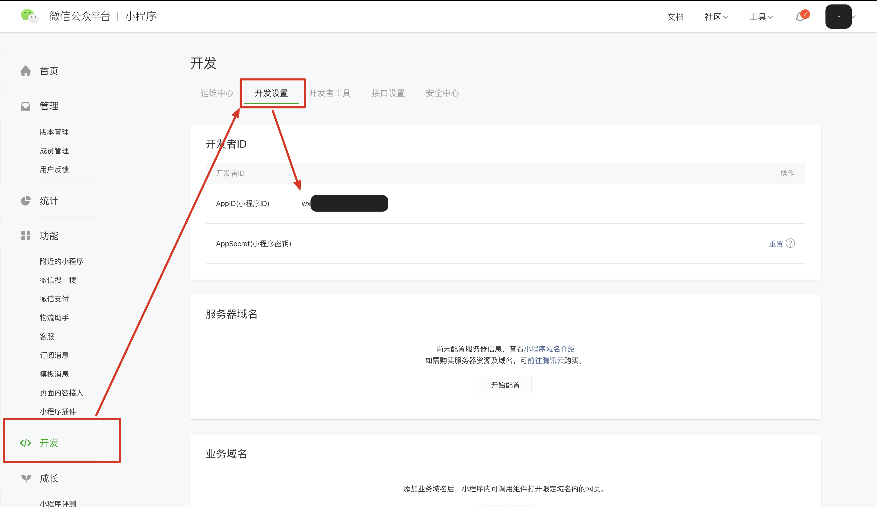 登录小程序平台后 -> 开发 -> 开发设置