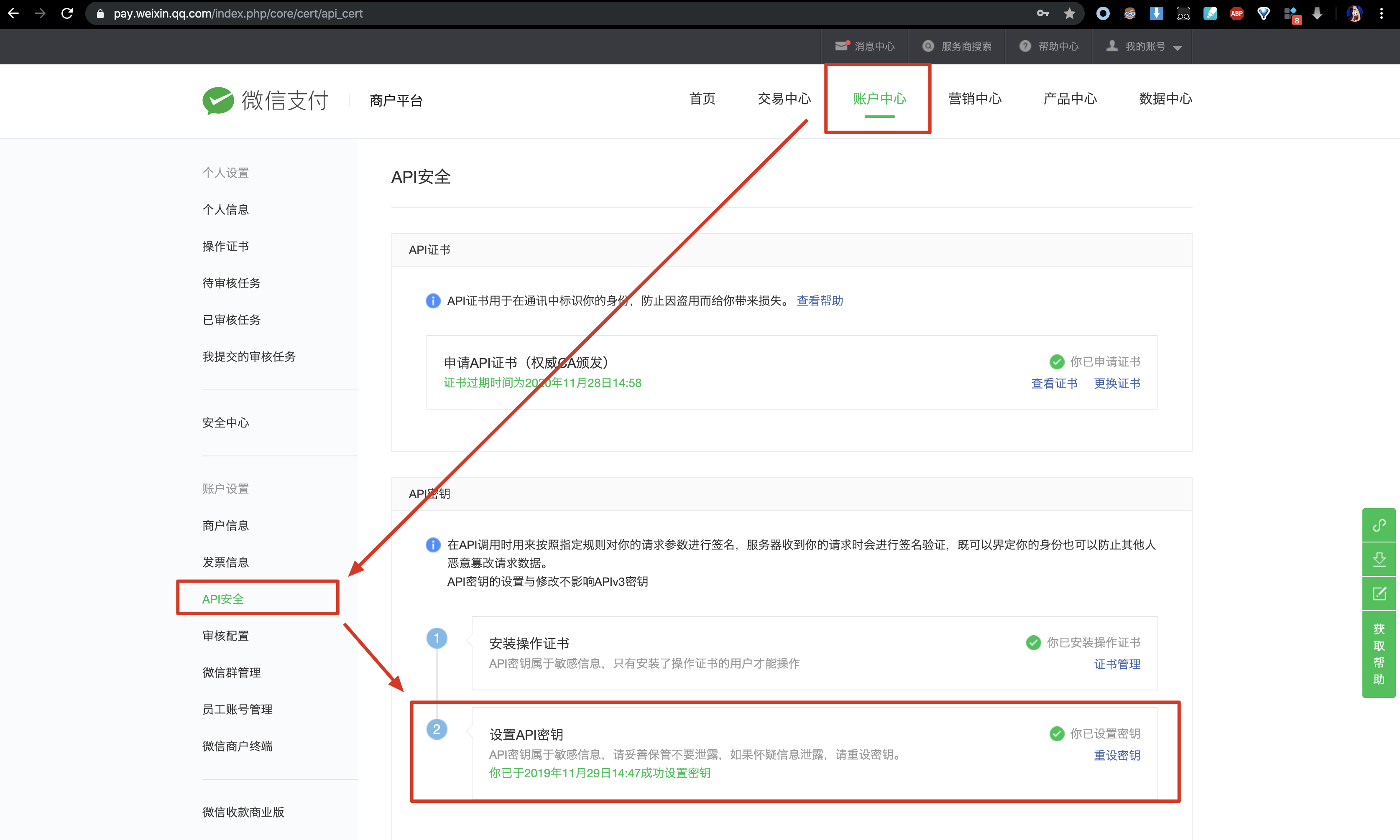 商户平台 -> 账户中心 -> API 安全 -> 设置 API 密钥。