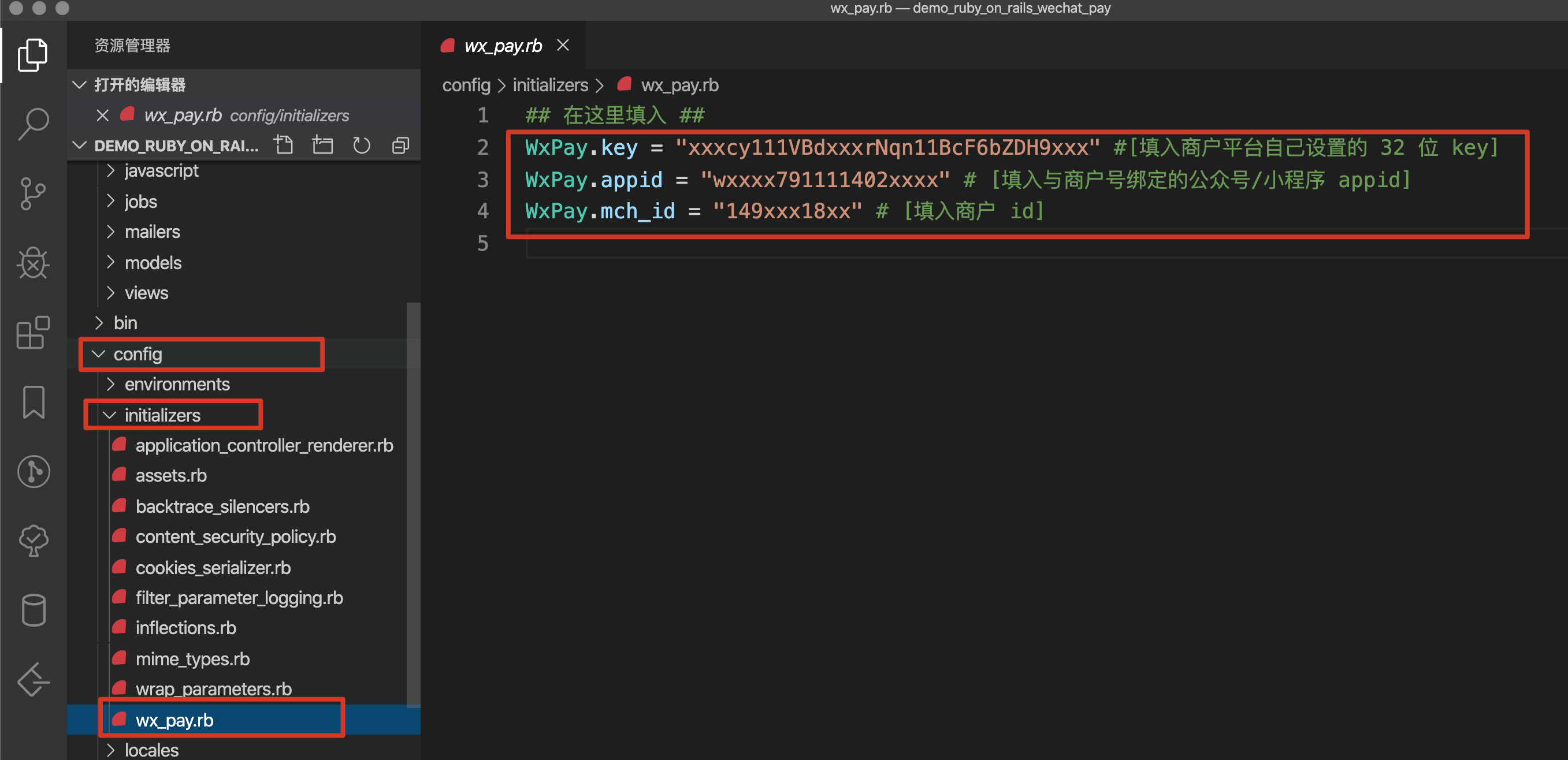 往 config/initializers/wx_pay.rb 里面填入必须信息