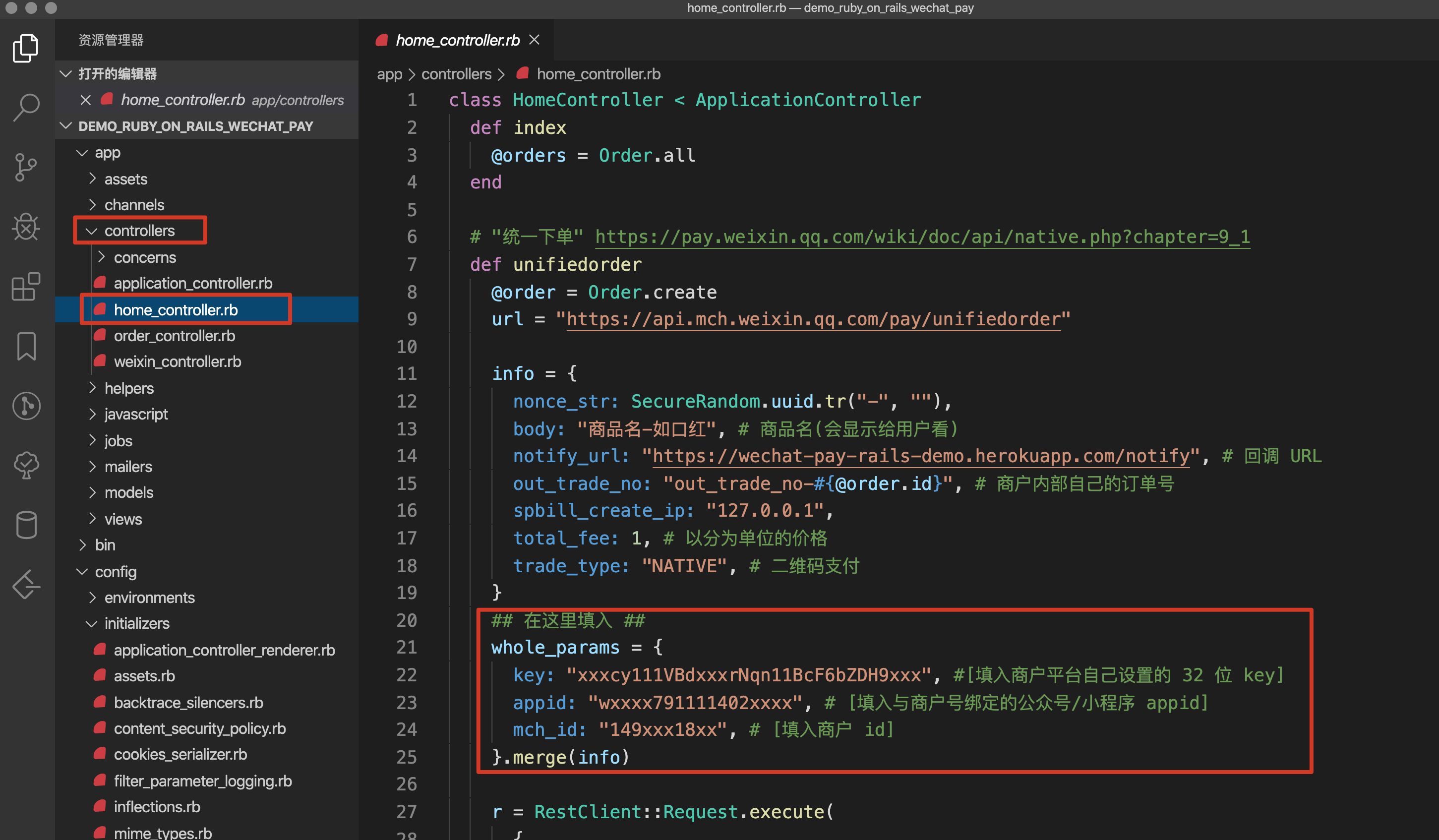 同样,也往 app/controllers/home_controller.rb 里面填入必要信息
