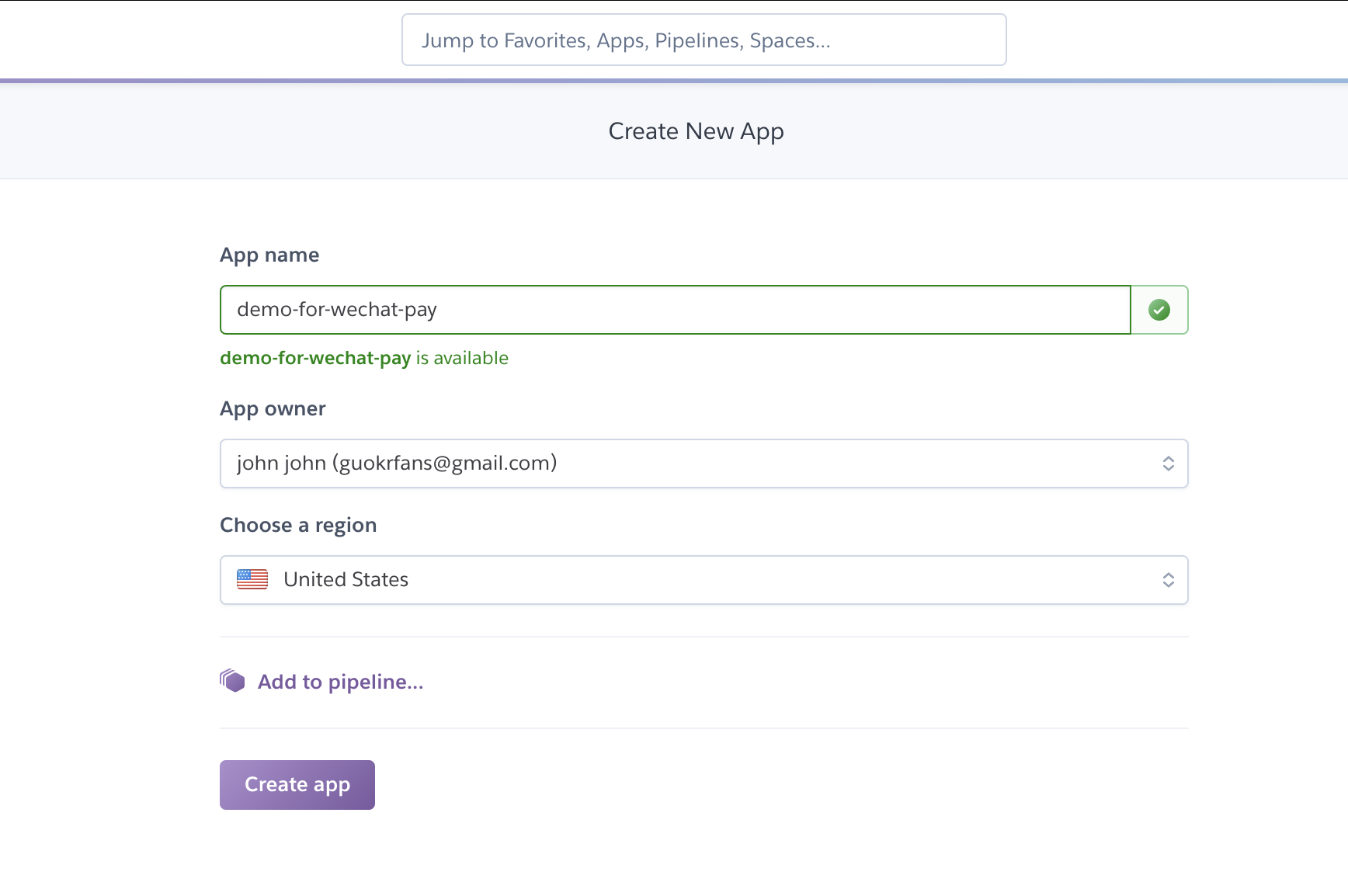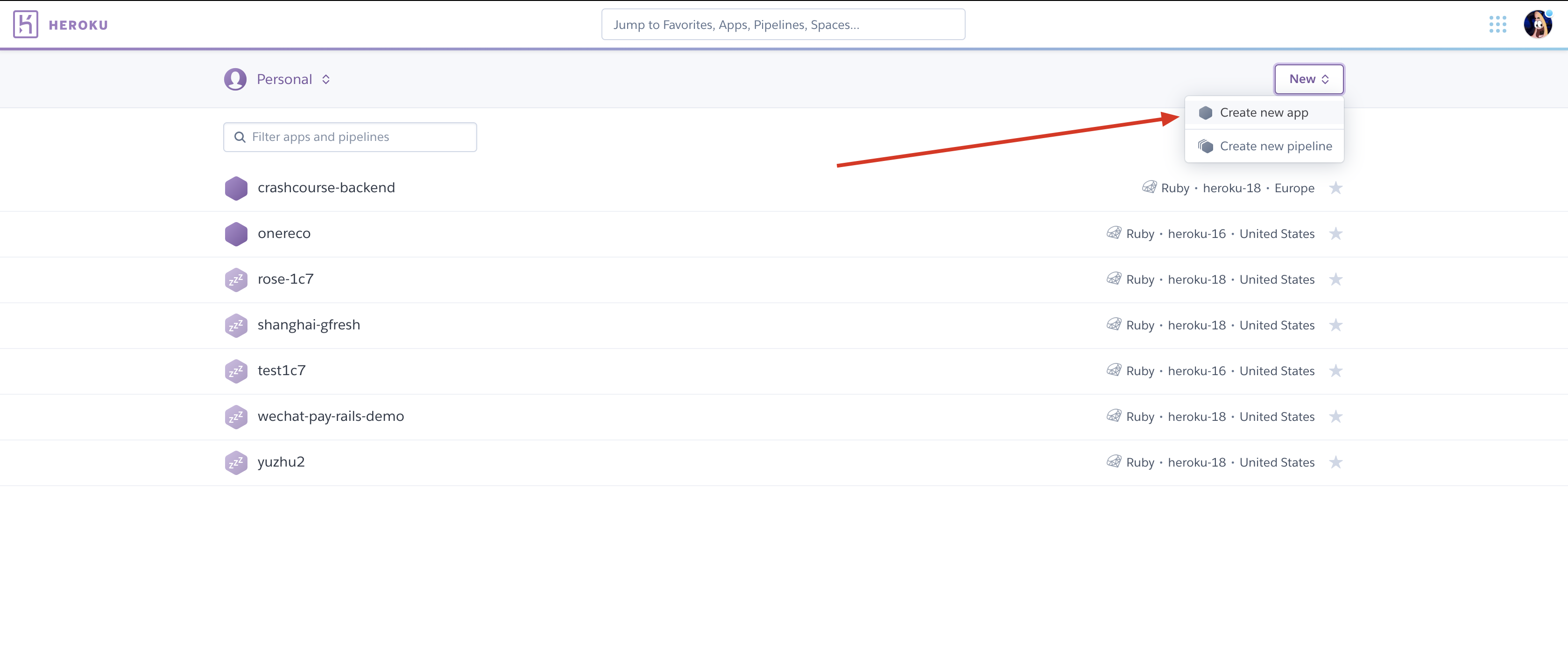 Heroku 操作步骤:登录后,在面板中选择右上角 new app