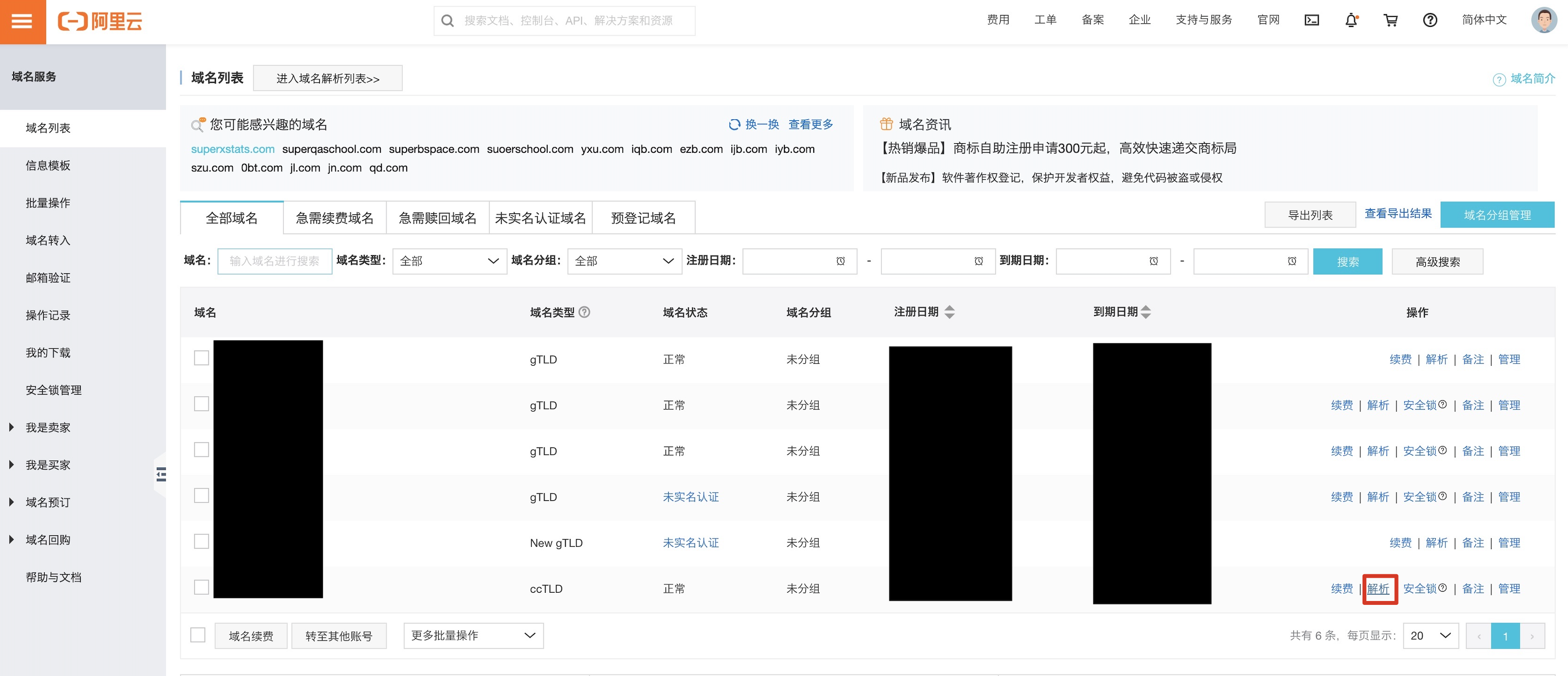 (找到域名,点击"解析")