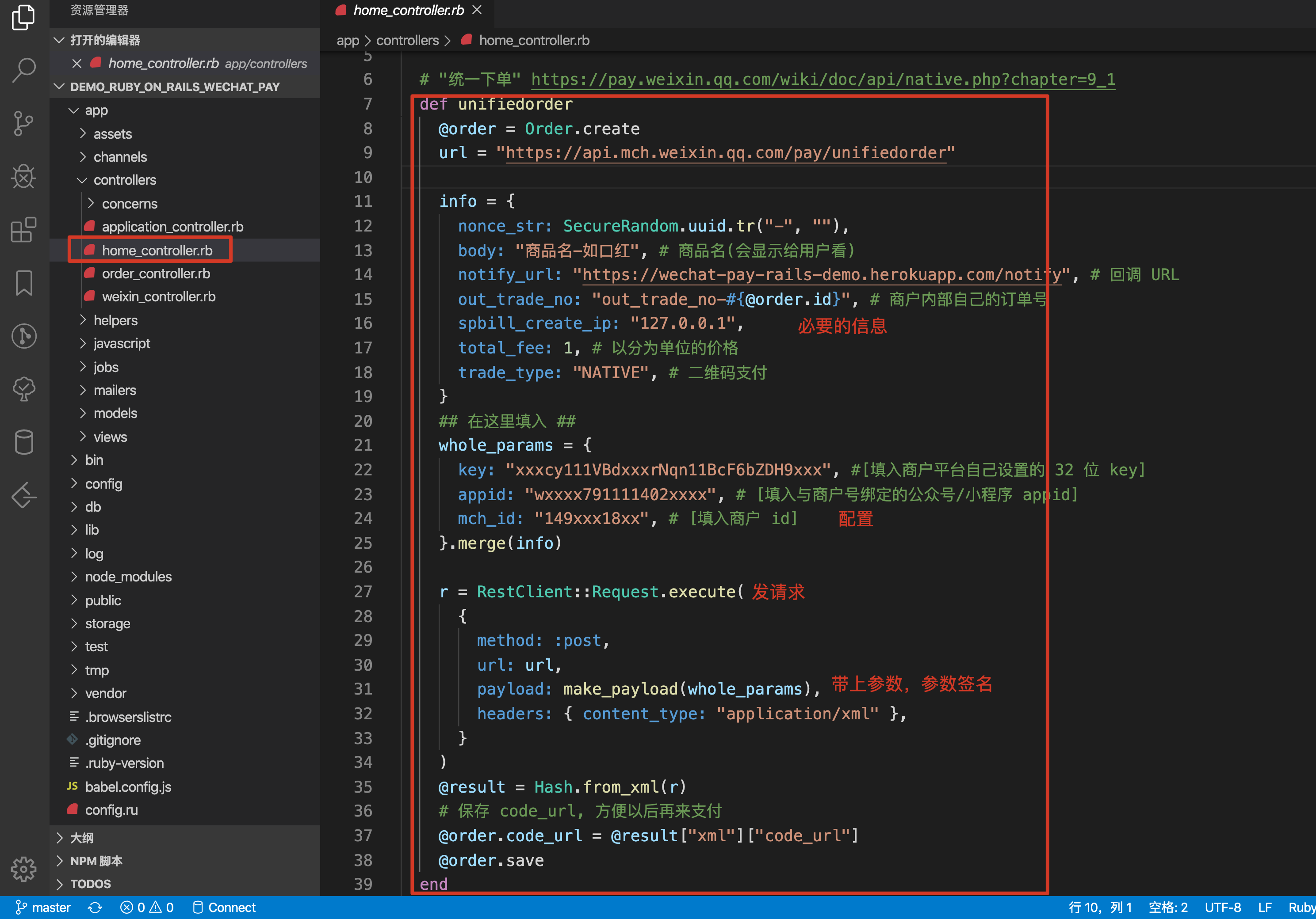 - 写上 key, appid, mch_id (whole_params = {})