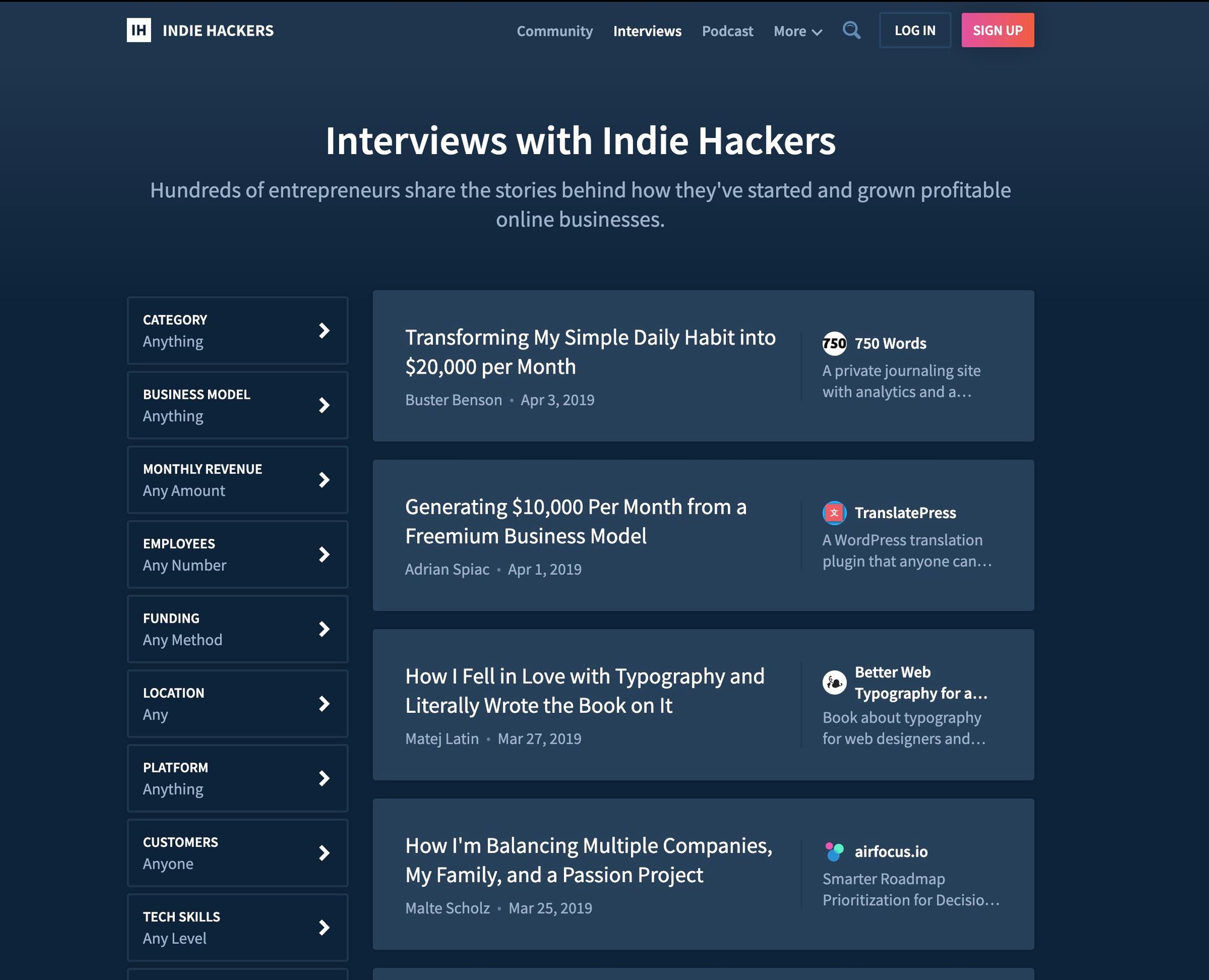 推荐 Indie Hacker 的理由:Interview 和 Podcast 可以学到别人是怎么盈利的,背后的思路是什么,经历是什么,尝试过什么。同时也是个社区,可以发帖讨论问题。