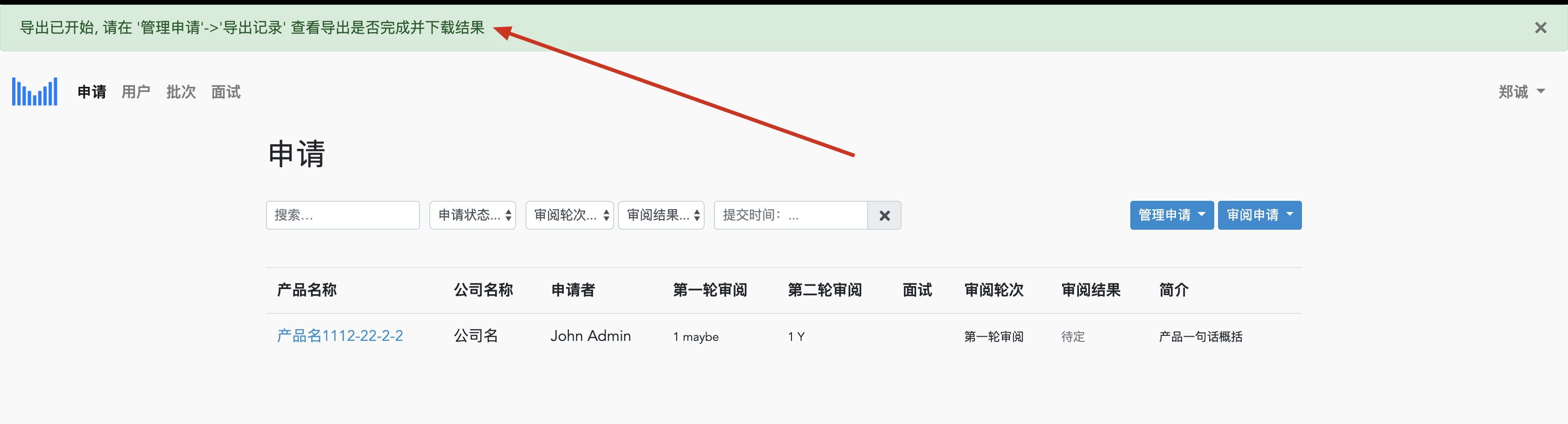 导出已开始, 请在 '管理申请'->'导出记录' 查看导出是否完成并下载结果