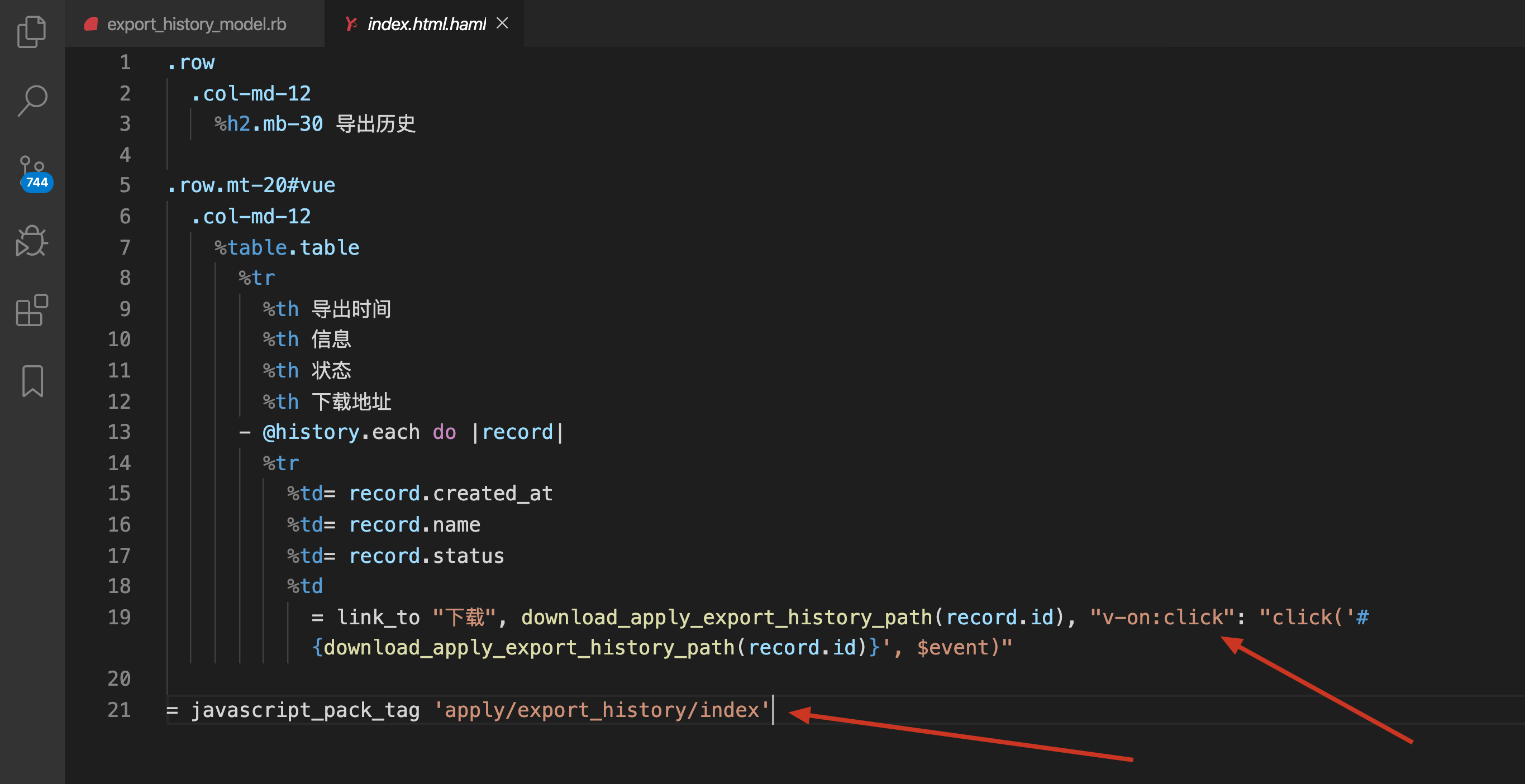 javascript_pack_tag引入一个 js 文件。待会我们要用它来下载 - 这里用了 Vue.js,所以有 v-on:click,传进去的参数是