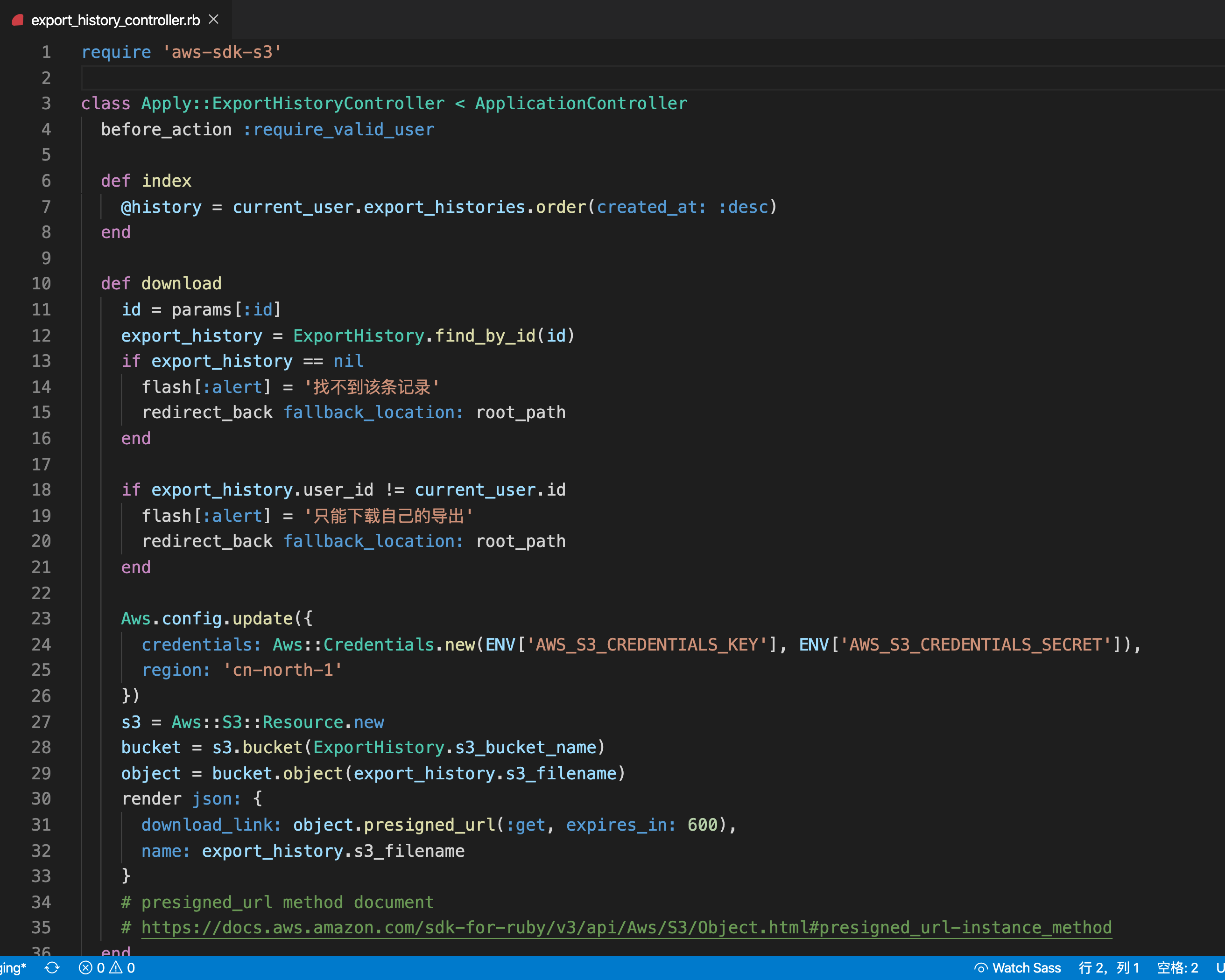 看看发了请求到 http://localhost:3000/export_history/12/download 之后到底发生什么