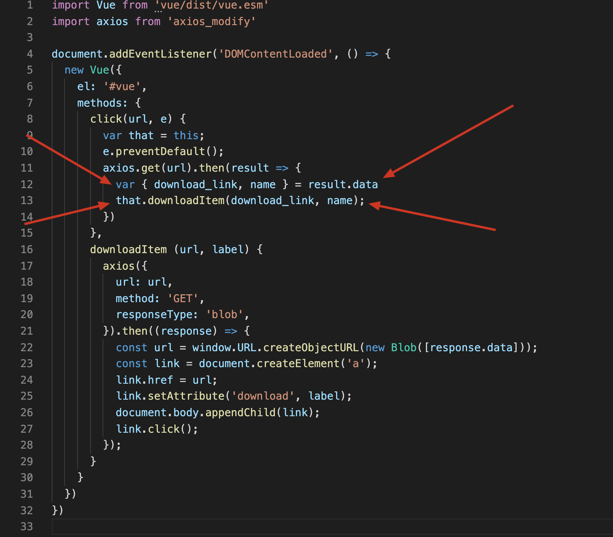 <a>元素的点击事件(就是之前那个"下载"俩字) - (第11行) axios.get(url) 发请求到
