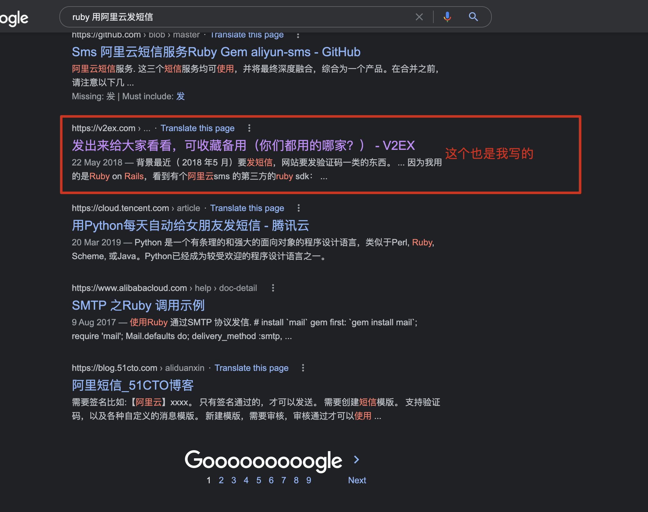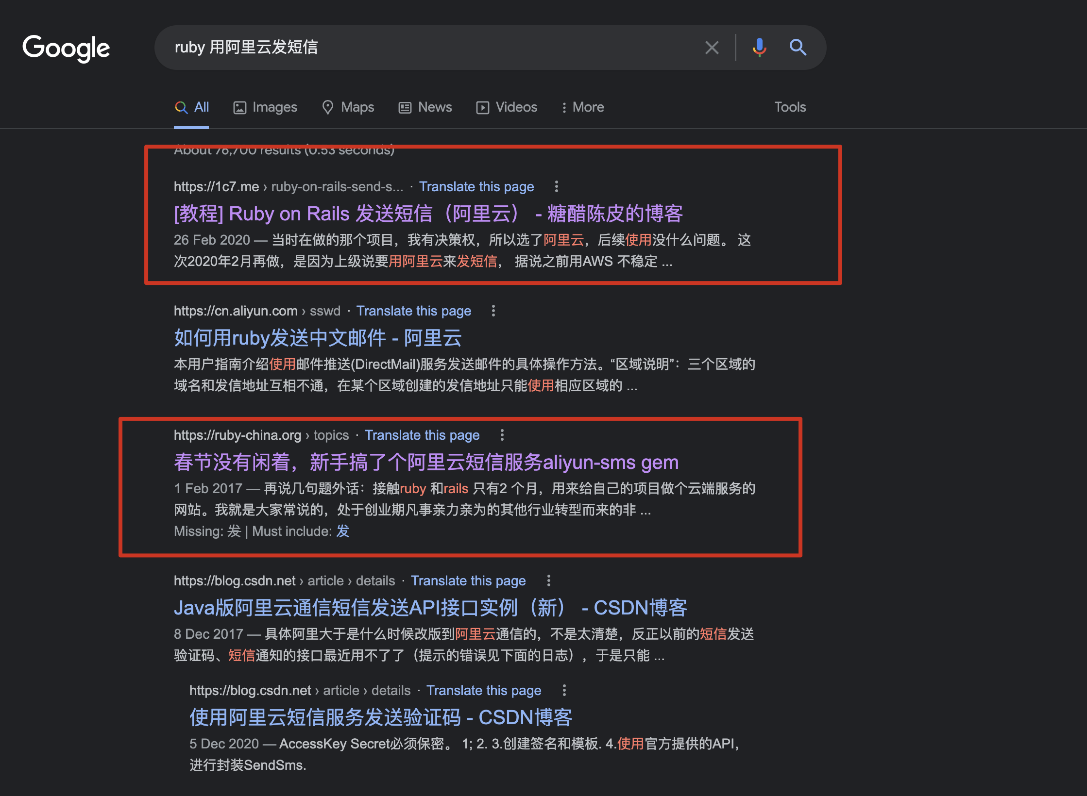 第一张截图,排名第一的那条,是我之前写的一篇文章。2020年2月写的,主要是介绍 gem 'aliyun-sms'。